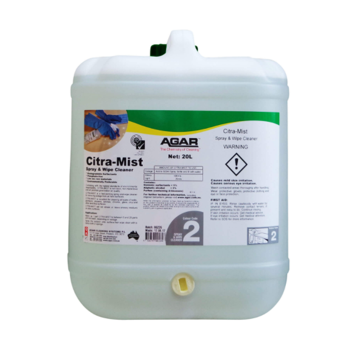 CITRA-MIST is excellent for cleaning all types of walls, table tops, benches, doors, Laminex, painted surfaces, vinyl and all other washable surfaces. With a spray and a wipe, CITRA-MIST will remove soil in one pass with no residues of 'films' being left on the surface. The pleasant perfume is intentionally mild to prevent irritation and maintain good indoor air quality.