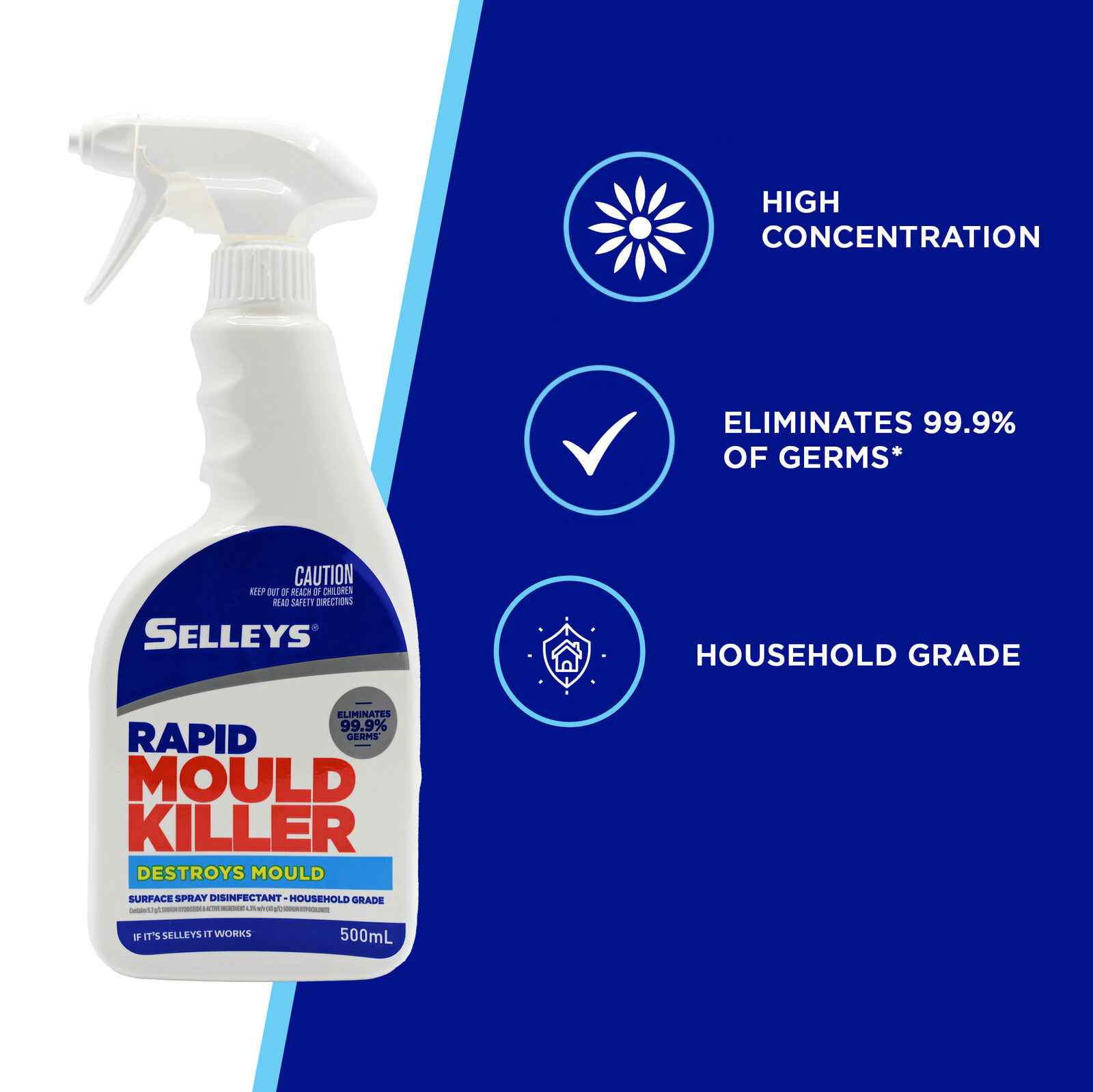 Selleys Rapid Mould Killer is a fast-acting mould killer. Its powerful formula destroys mould and eliminates 99.9% of germs (Escherichia Coli, Staphylococcus Aureus, Pseudomonas Aeruginosa, Enterococcus Hirae).