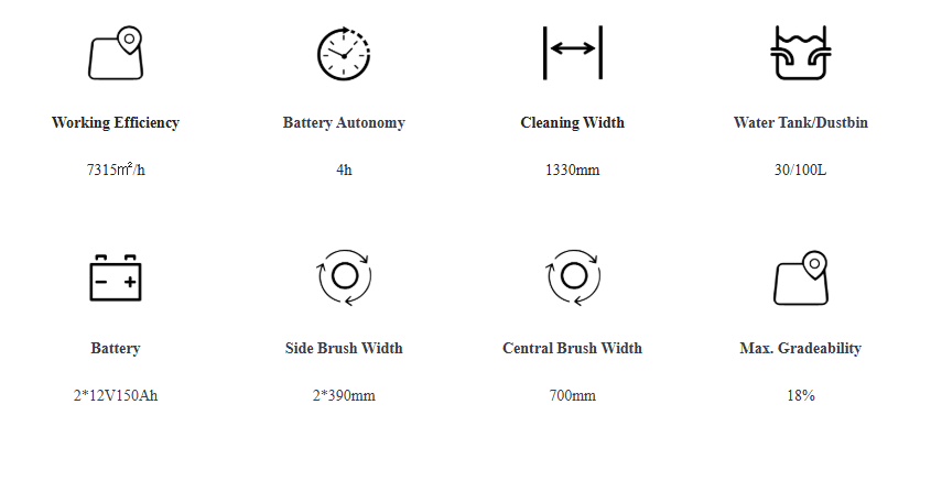 Specifications of TVX Ride-on Outdoor Road Street Floor Sweeping Machine TS1300: